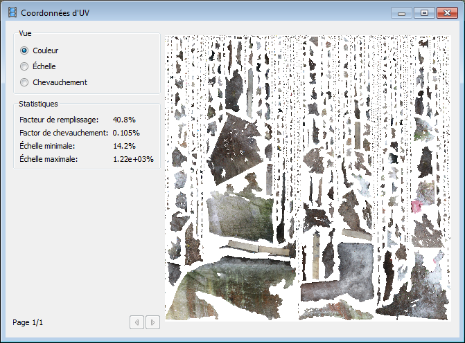 La dernière étape consiste en la création de la texture. On retourne dans le menu « Traitements / Construire une texture… ». La question de la texture va conditionner la suite du travail. En effet, l’organisation des pixels en fonction du maillage va faciliter ou non la suite des opérations selon ce que l’on cherche à produire. Si le modèle reste un modèle haute définition servant à l’impression de planches, pour créer des orthovues par exemple, la question est moins prégnante. S’il s’agit de travailler les aspects visuels pour faire ressortir de l’information, ou s’il est question de créer à terme un modèle fonctionnant pour le temps réel, il faudra dès lors obtenir une texture la plus continue possible, que l’on pourra ensuite retravailler avec un logiciel de dessin.