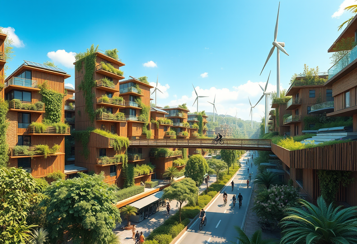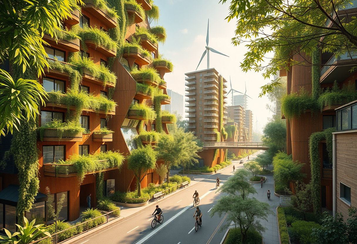 « Reimagine an urban street scene transformed into a biodesigned environment, where buildings are constructed from natural materials like wood, bamboo, and living plants. Incorporate sun-protecting structures, such as green roofs with solar panels, large plant-based canopy shades, and walls covered in vegetation. Add small vertical wind turbines seamlessly integrated into the street’s infrastructure. The streets are lively with many people riding bikes, adding to the eco-friendly atmosphere. The overall design should feel like an organic fusion of nature and technology, with flowing, sustainable architecture, soft natural lighting, and a serene, vibrant urban setting where sustainability and nature-driven design thrive. »