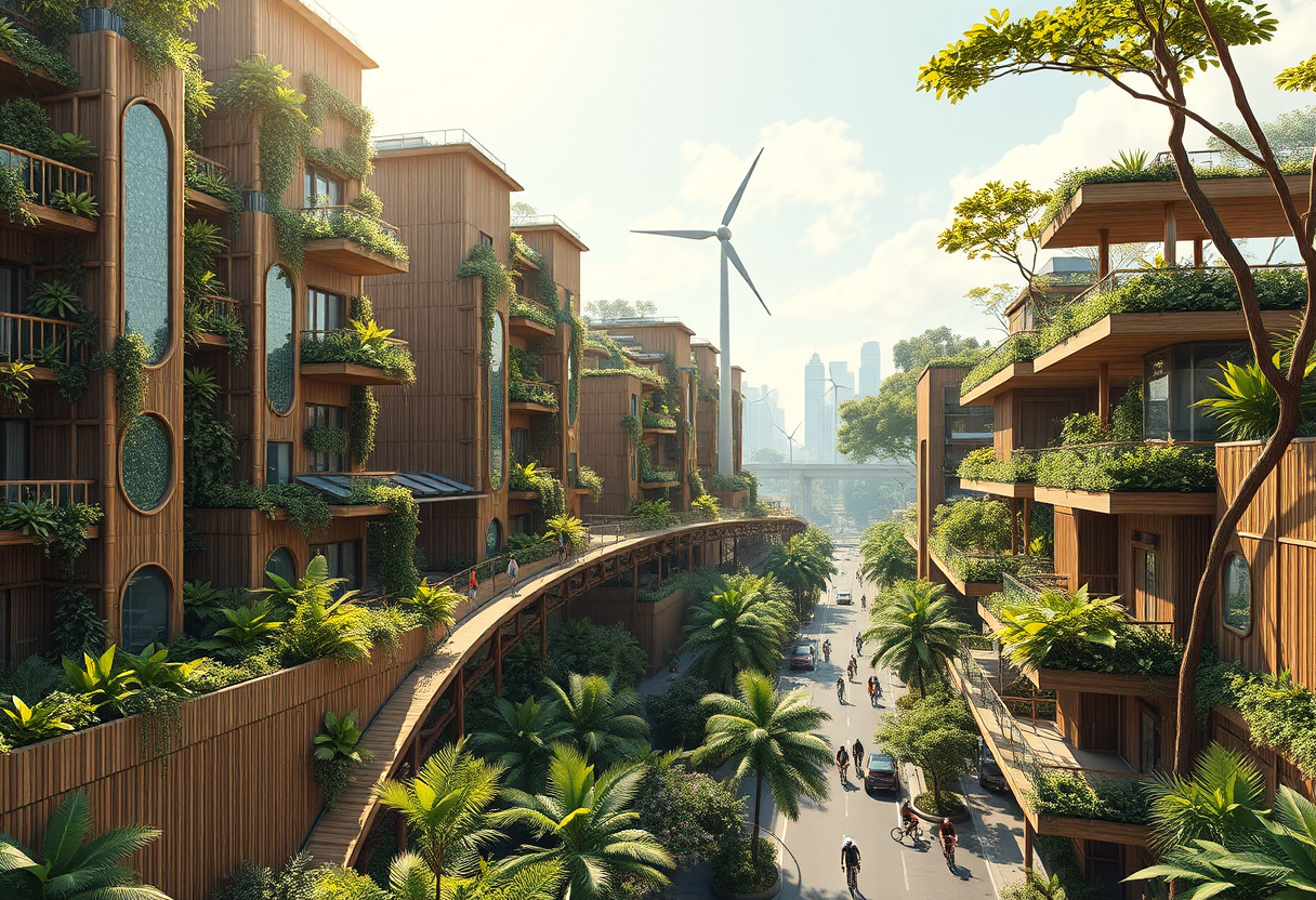 Photo hyper-realistic urban biodesign: Sunlight filters through towering bamboo 5 stories houses, their facades alive with verdant vertical gardens planted with small plants. Sinuous wooden bridges connect green roofs adorned with shimmering solar panels. Sleek wind turbines spin silently amidst lush canopies. Cyclists weave through streets paved with photocatalytic materials, purifying air. Nikon camera, magic hour.