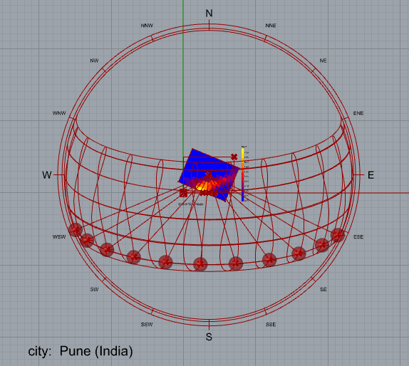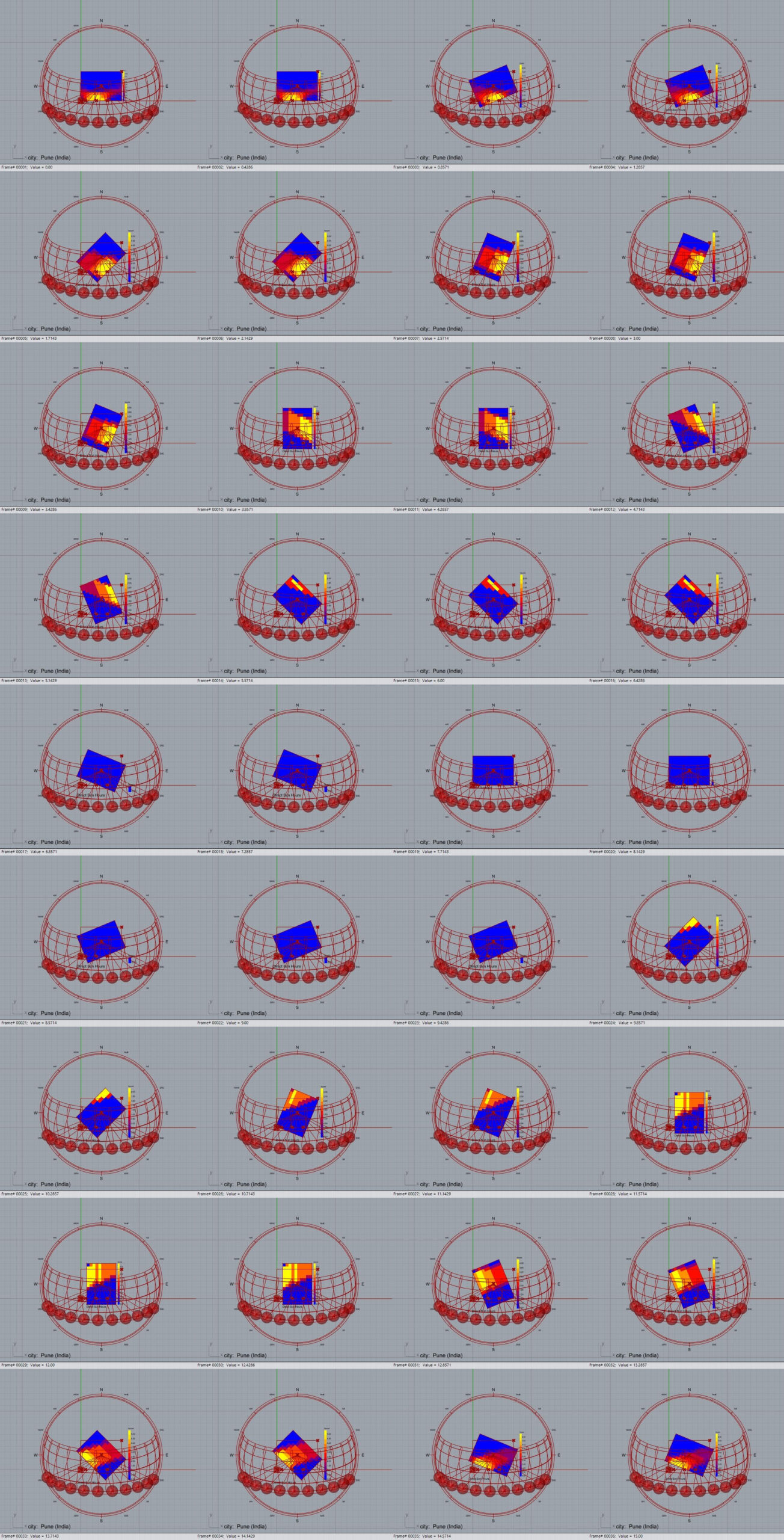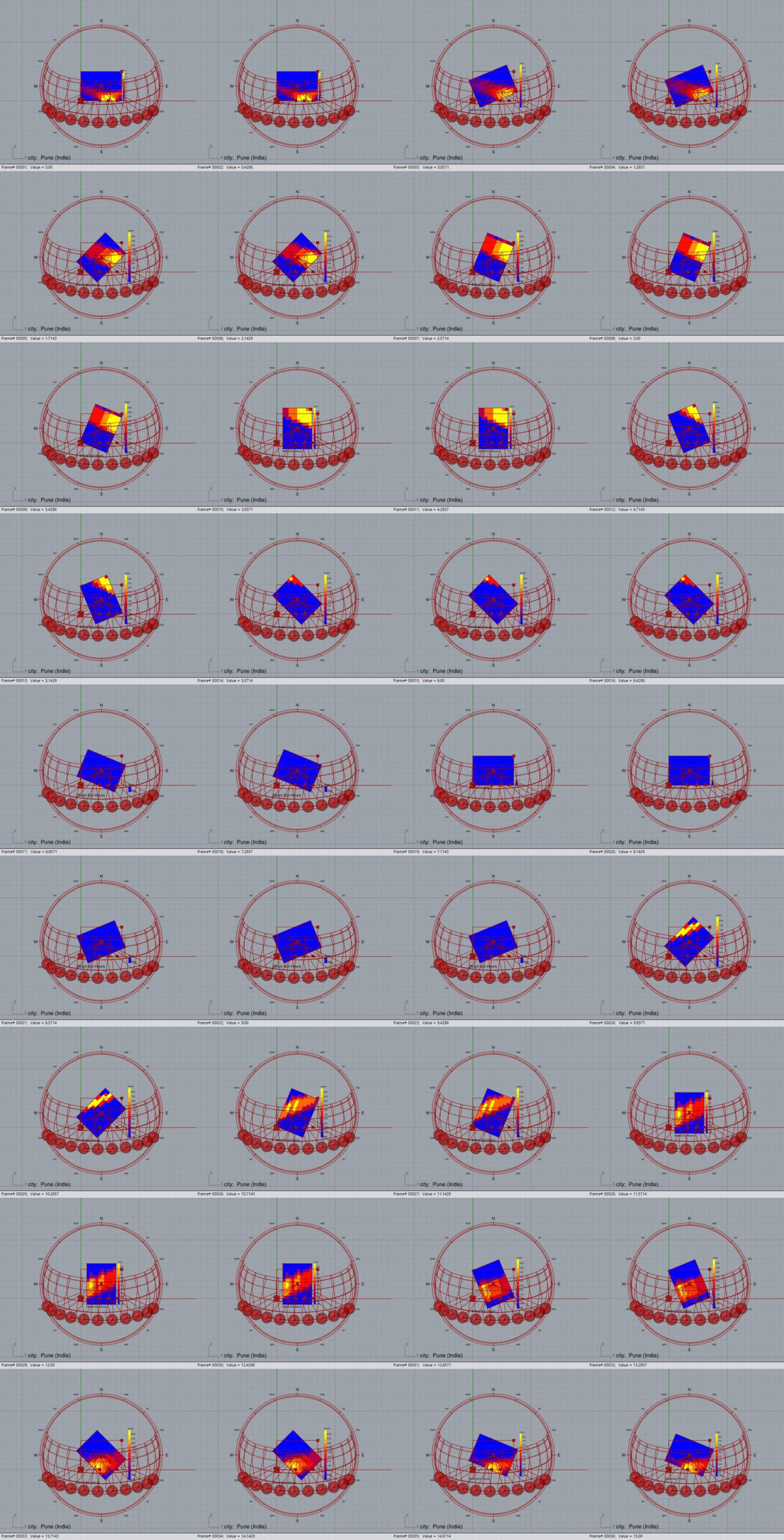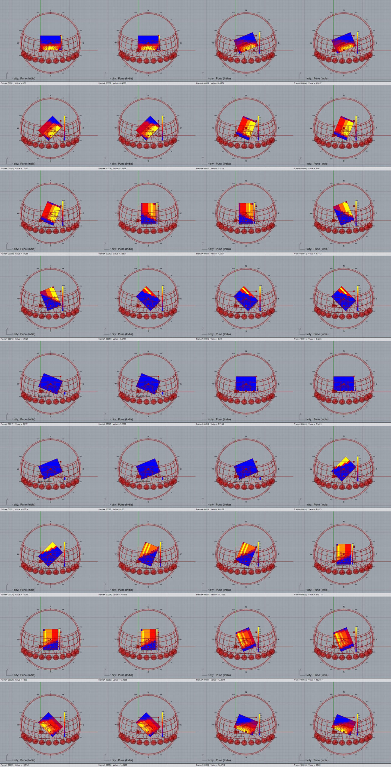 - For Pune (a hot climate): The primary goal is usually to minimize solar radiation to reduce the amount of heat entering the building and thus lower the need for air conditioning. A « better » design in this context is one that shows cooler colors (blue/green), indicating lower radiation values.
