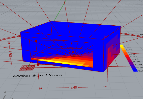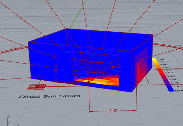- Calculation: This component calculates the cumulative solar radiation in kilowatt-hours per square meter (kWh/m2) that strikes each point on the analysis _geometry (the window) during the specified period.