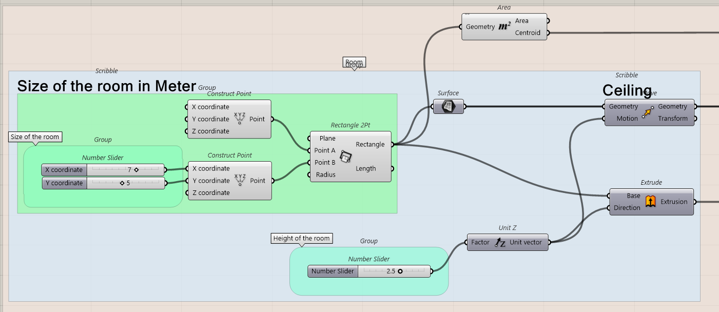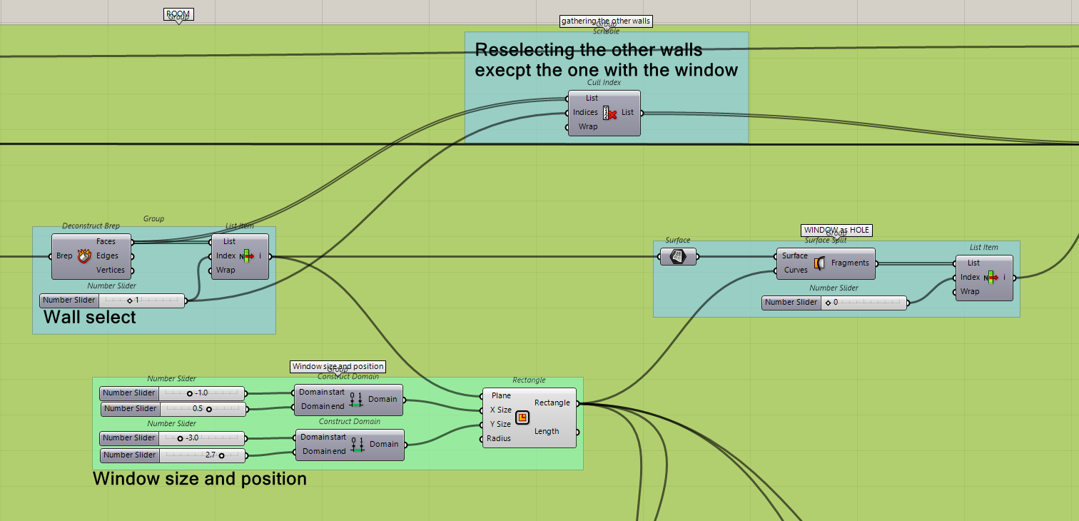- Analysis Geometry (The Window): A separate set of components creates the window. Number Sliders are used to control its width and height. Another slider likely controls its position on the wall. This surface is the primary geometry we want to analyze.