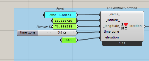 - Load Weather File: The Ladybug_Import EPW component is used here. You must connect a File Path component containing the location of your Pune .epw weather file to its _epwFile input. This component extracts location data, sun positions, and radiation values for the entire year.