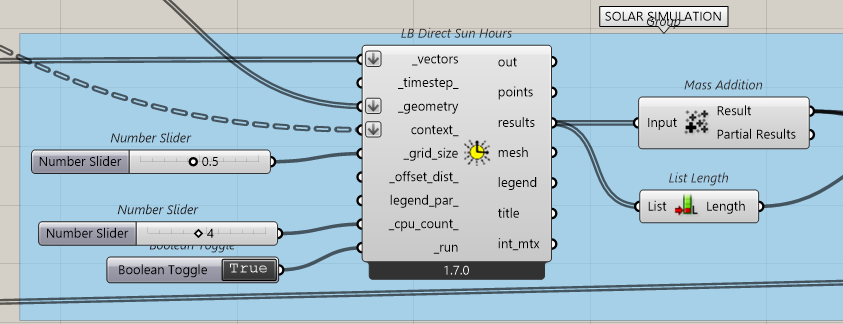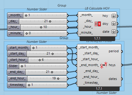 - _analysisPeriod: The output from the Analysis Period component is connected here to specify the simulation time frame.