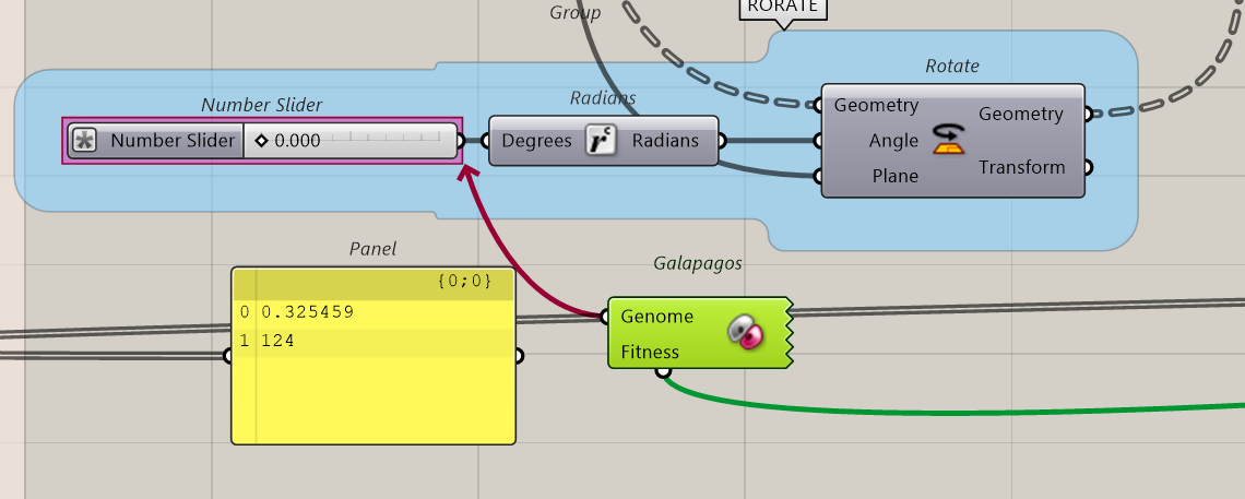 - A Genome: The parameter(s) it is allowed to change (in our case, the orientation Number Slider).