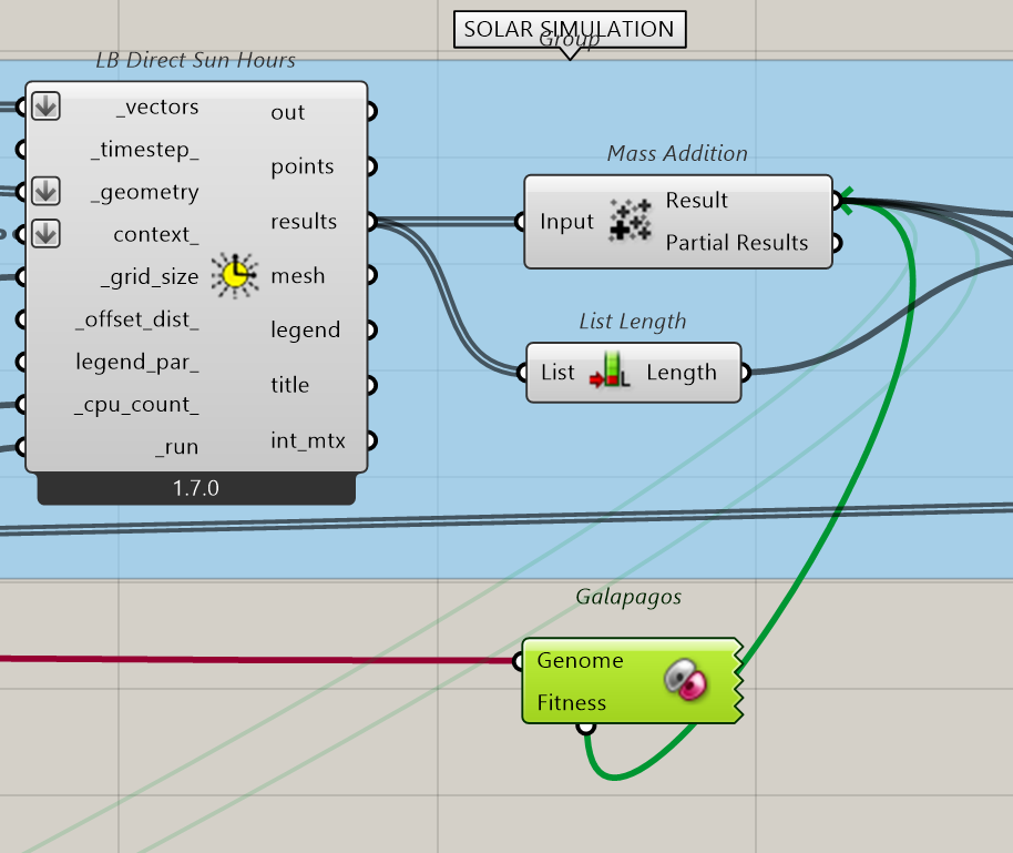 - Defining Fitness Value: For minimizing solar radiation, the sum of all radiation values from the Ladybug_Radiation Analysis (calculated via a Mass Addition component) serves as the Fitness value.