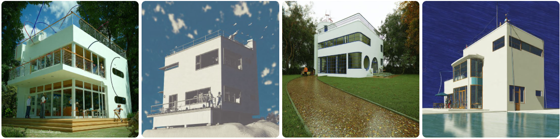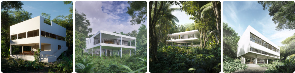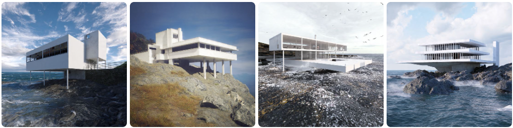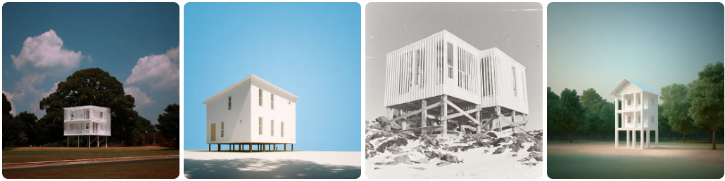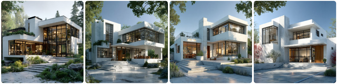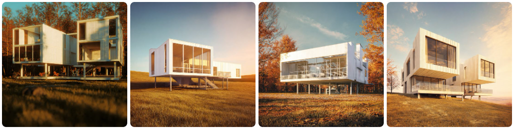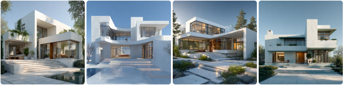 - “Maison contemporaine blanche sur pilotis, volumes épurés, grandes baies vitrées, parement bois clair, rendu photoréaliste, golden hour, lumière chaude rasante, ombres longues, objectif 35 mm, profondeur de champ modérée.”