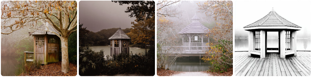 - “Petit pavillon en bois au bord d’un lac, matin brumeux, composition centrée.”