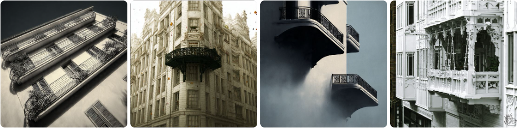 - “Façade d’immeuble urbain, balcon filant, perspective rue, ambiance neutre.”