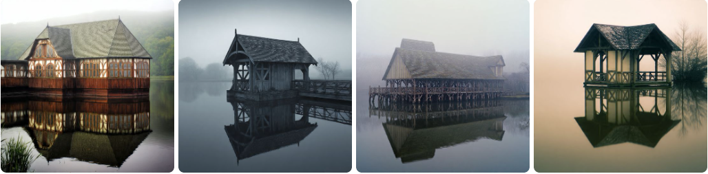 - “Pavillon en bois au bord d’un lac, structure en colombage, toiture ardoise, reflet sur l’eau, brouillard matinal diffus, style documentaire architectural.”