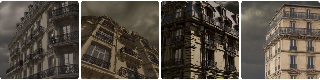 - “Façade d’immeuble Haussmannien, pierre blonde, balcons en fer forgé, ciel couvert, rendu réaliste, texture pierre visible, vue depuis la rue.”