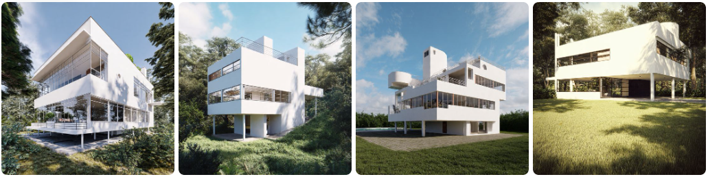 Prompt : Maison inspirée par les principes du modernisme: pilotis fins, volume blanc pur, bandeaux continus de fenêtres, toiture-terrasse, plan libre — style Le Corbusier inspiré mais interprété — vue trois-quarts, rendu photoréaliste, lumière de milieu de journée. –chaos 10 –stylize 0