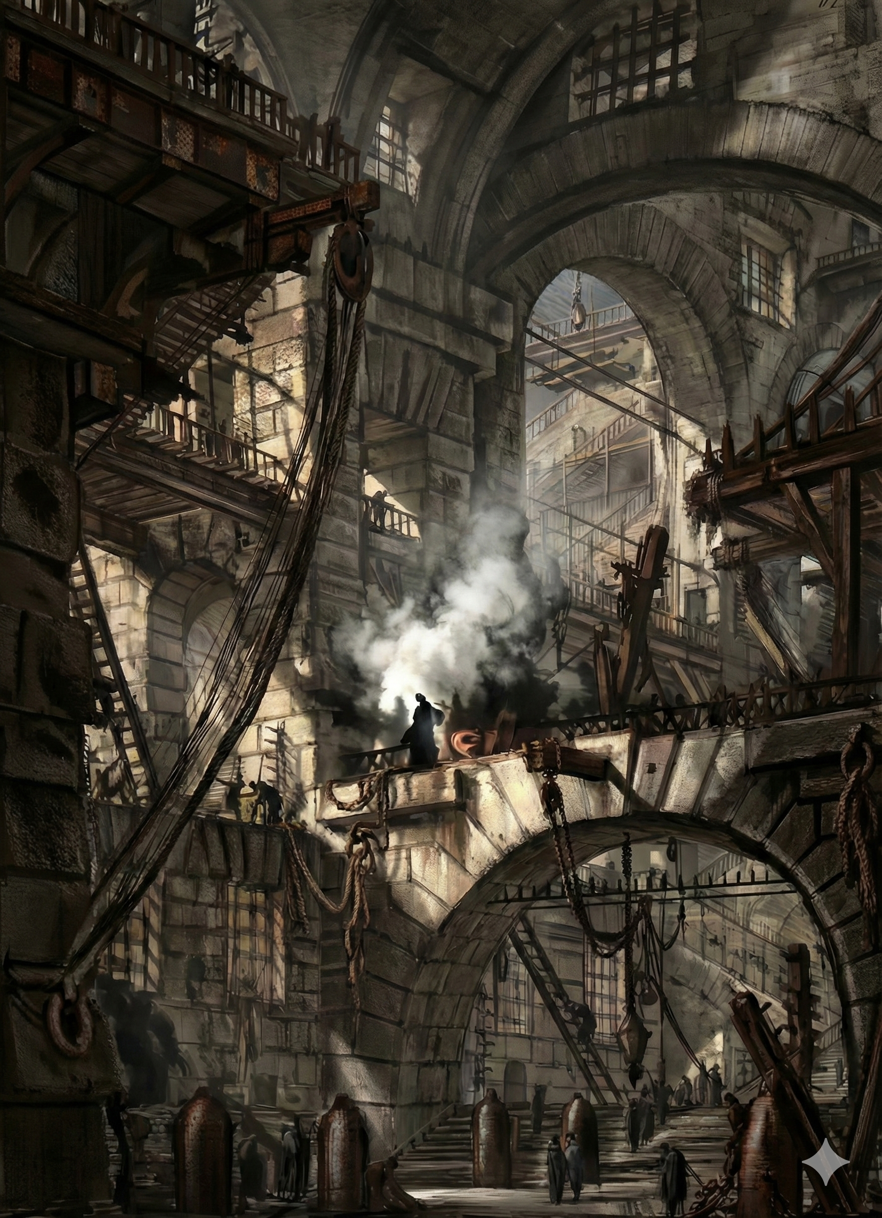 Le maniement du chiaroscuro atteint ici une intensité chirurgicale. Cependant, lorsque l’intelligence artificielle s’empare de ces ombres (Source ComfyUI_00197_.png), elle opère une métamorphose troublante : en adoucissant les fumées et les vapeurs, l’algorithme transforme la rigueur de la gravure en un rêve vaporeux. La prison devient moins une construction littérale qu’une émanation de l’inconscient, confirmant que l’esprit est un cachot bien plus vaste que n’importe quelle cellule de pierre.
