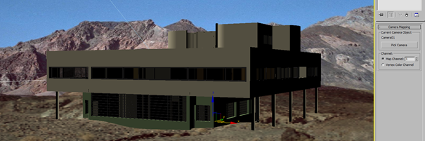 Le bâtiment à l’avant plan est texturé en texture caméra comme pour le terrain dans l’exemple précédent.