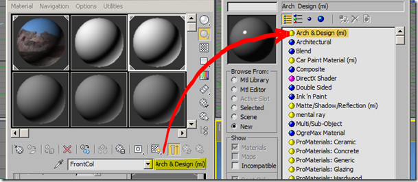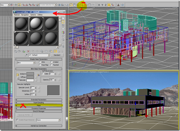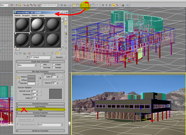 Comme l’exportation a été réalisée en fonction des textures, il est possible de les modifier toutes rapidement pour les adapter au moteur « mental ray ». Utiliser la pipette pour échatilloner une texture, le mur extérieur par exemple.