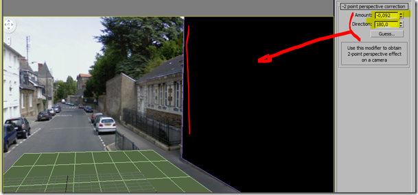 Une autre solution consiste à régler à l’œil la perspective. Il faut travailler avec la grille, transformer la perspective en vue caméra (CTRL+C) et mondifier la focale.
