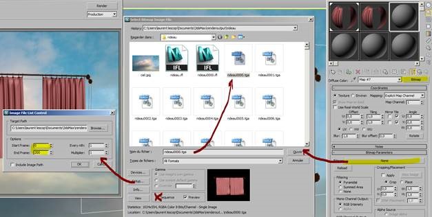 Ouvrir l’éditeur de matériaux, choisir dans comme diffuse « Bitmap » et prendre la première des images de la suite TGA. Cocher « Séquence ». Valider la séquence de 0 à 200 (correspondant à l’exemple).