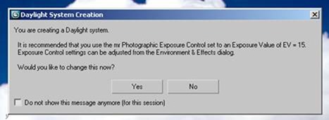 Vue en plan (T) onglet systemes / daylight. Dans la version 2009, apparait ce message qui lance le réglage automatique de la lumière. Dans la version 2008, ce message n’apparait pas ce qui obligera à opérer les derniers réglages à la main.