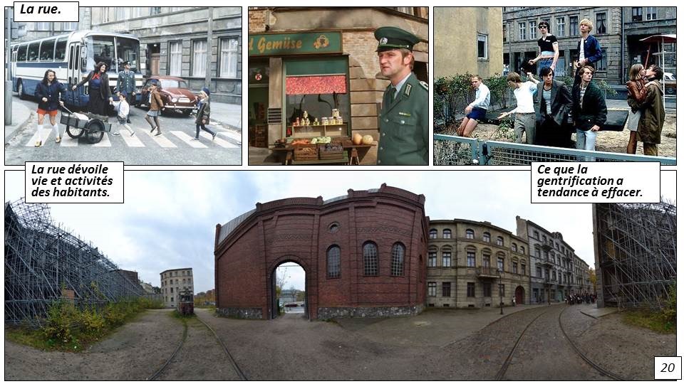 Il s’agit donc bien d’un processus de constitution d’un lieu où vont se croiser les éléments du triptyque identification / relations / historicité (Augé 1992). Dans la Berliner Straße, le décor donne des éléments de reconnaissance et d’historicité dont l’identification se fera sans ambigüité, les acteurs et figurants simulent les relations. L’ensemble identifie le lieu de l’action, la scène, l’espace de où le récit se développe : la diégèse.