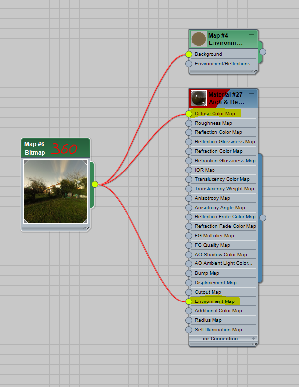 Apply a Arch&Design material. Set the 360 image as Diffuse and Environmental. This has been done on a chrome material.